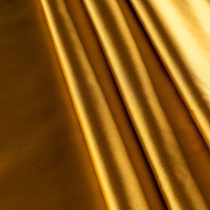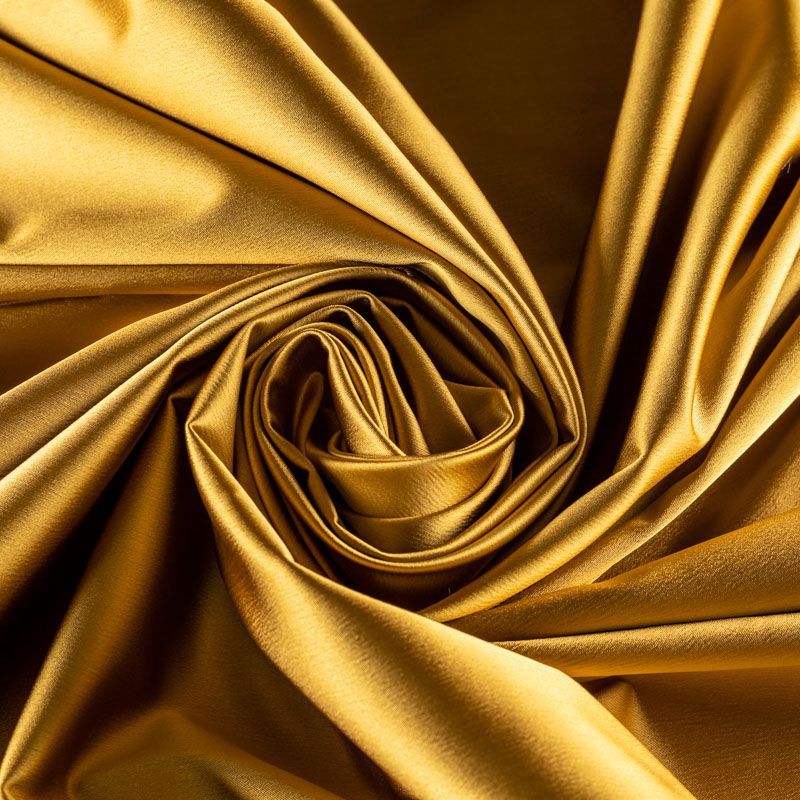 Итальянский костюмно-плательный атлас ватуссо оттенка темного золота. Ткань плотная, но пластичная, хорошо держит форму и отлично тянется, собирается в красивые складки и драпировки. Почти не мнется, очень удобный и практичный. Блеск умеренный, смотрится дорого, благородно. Подойдет для пошива прямых силуэтов-футляров, приталенных платьев с пышной юбкой и крупными драпировками, изделий с заложенными складками, нарядных изделий, вечерних костюмов, летнего пальто, юбки, для изготовления корсетов.