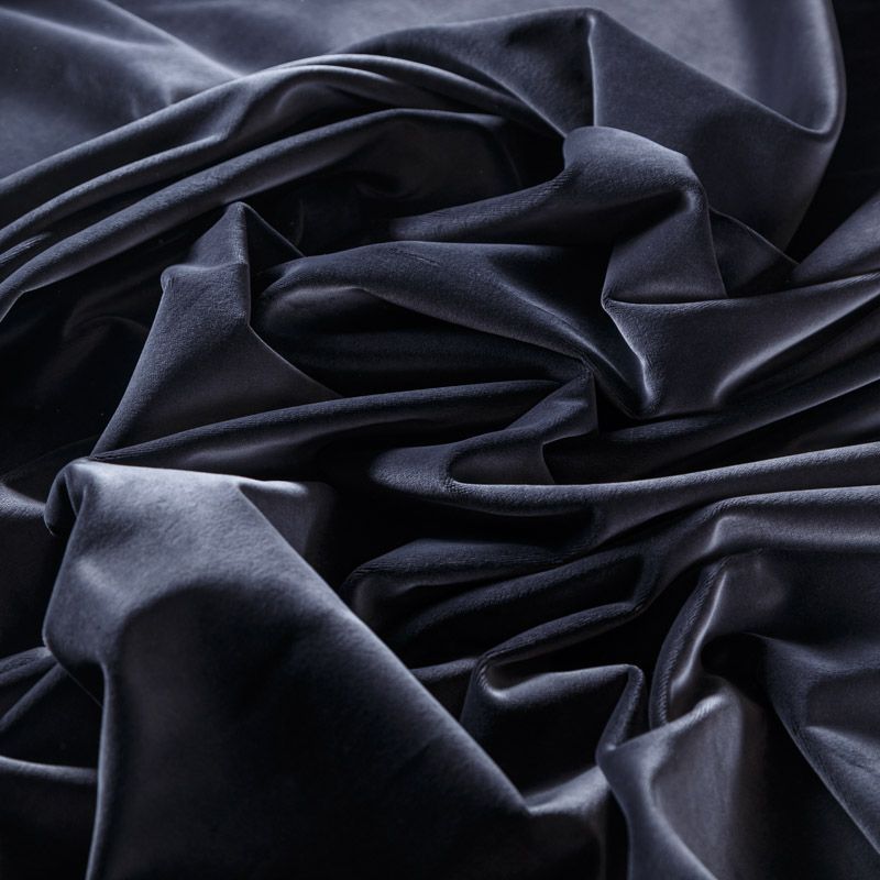 Хлопковый бархат припыленного синего оттенка. Ткань плотная, мягкая с коротким ворсом, отлично держит форму. Имеет благородный матовый оттенок. Подойдет для пошива нарядного костюма, жакета, юбки, жилета, шорт, комбинезонов, брюк, платья-футляр, легкого пальто или бомбера.