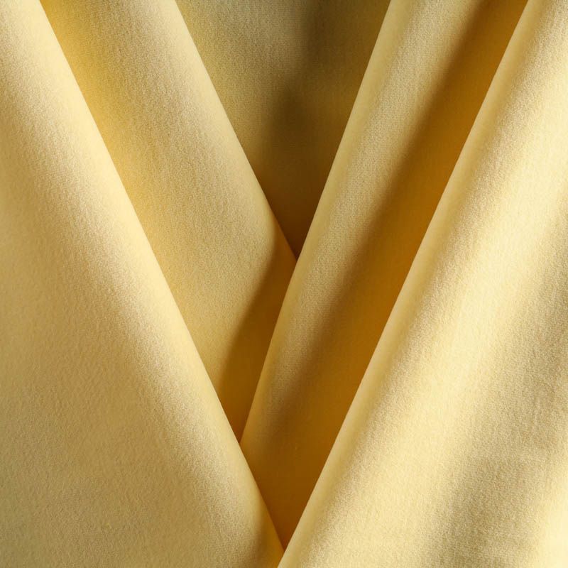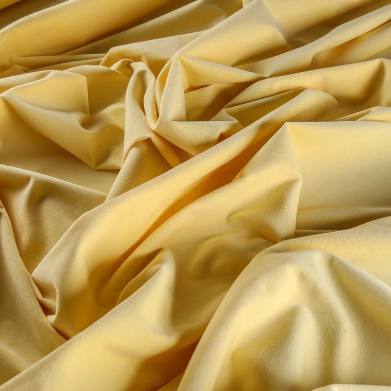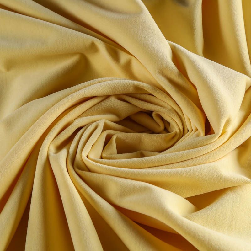 Плотный итальянский бархат из хлопка нежного оттенка мякоти банана с добавлением небольшого количества эластана. Ткань очень приятная на ощупь, пластичная, поверхность матовая, немного тянется, держит форму, прочная, износостойкая. Идеально подойдет для нарядного костюма, жакета, юбки, жилета, комбинезона, брюк, платья-футляра.