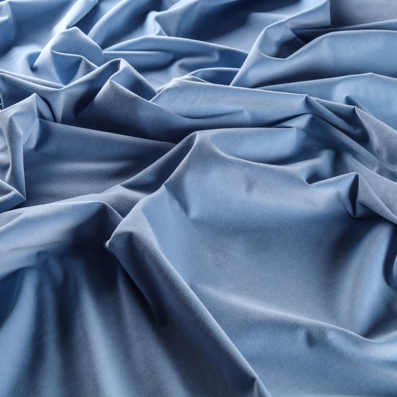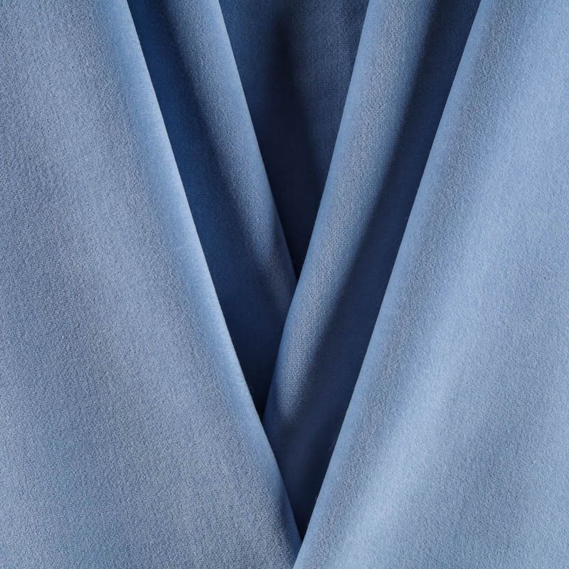 Плотный бархат из хлопка холодного голубого оттенка с добавлением небольшого процента эластана. Ткань очень приятная на ощупь, пластична, поверхность матовая, хорошо держит форму, а также прочна - идеальна для костюма, жакета, юбки, жилета, брюк, платья-футляра, легкого пальто, бомбера.