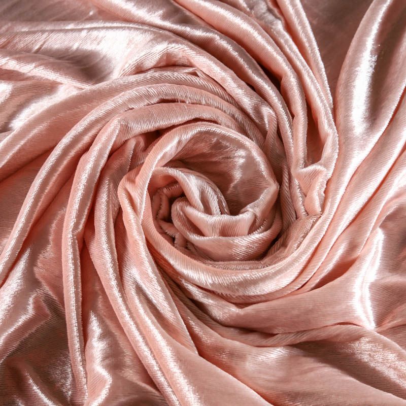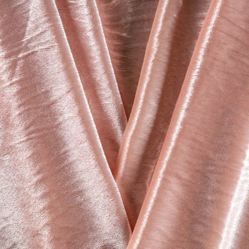 Бархат с небольшим ворсом пудрового оттенка с эффектом люрекса. Ткань очень приятна на ощупь, не мнется, мягкая, нежная, хорошо тянется и драпируется. Цвет играет отблесками и полутонами. Бархат идеально подходит для пошива вечерних платьев, юбок, костюмов, а также стильных аксессуаров.