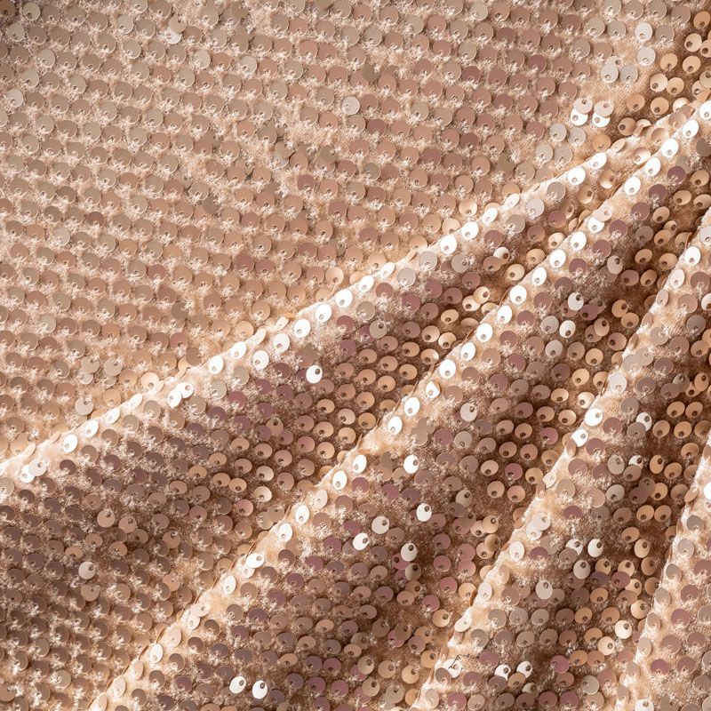 Бархатное полотно на трикотажной основе теплого золотисто-бежевого оттенка. По всей поверхности ткань усеяна матовыми пайетками, которые очень деликатно отражают свет. Бархат достаточно тонкий и пластичный, прекрасно драпируется и укладывается в складки. Пайетки на бархате эффектно смотрятся в виде широких оборок и воланов, юбок прямого силуэта, свободных платьев-балахонов, курток, бомберов и топов с напусками.