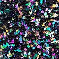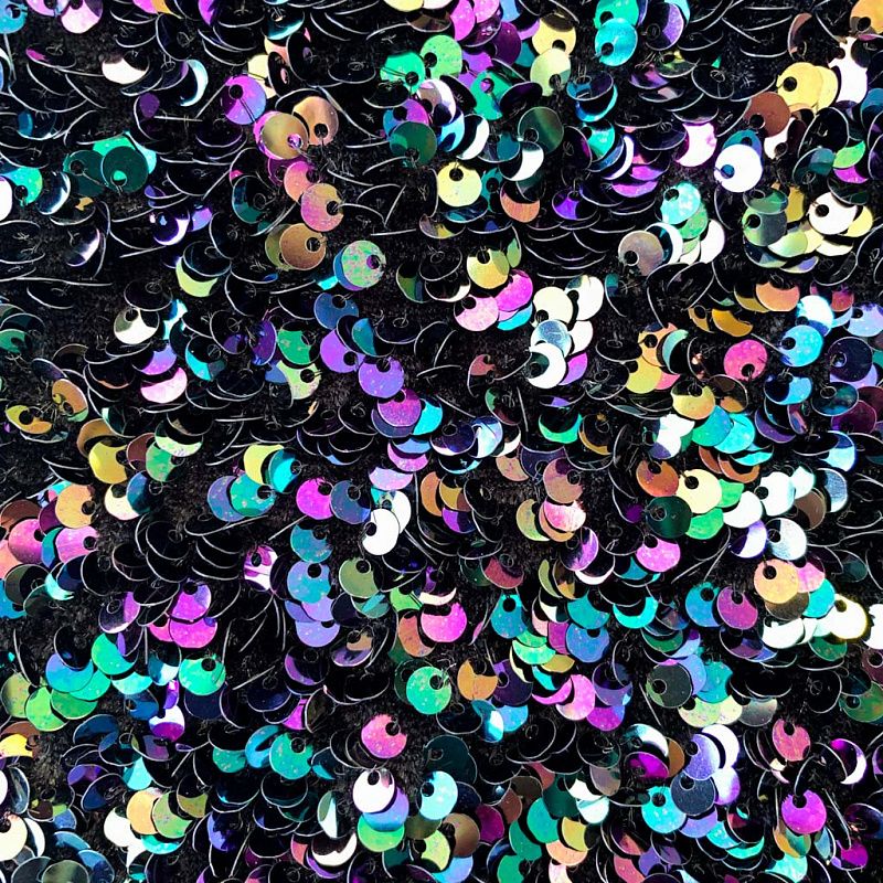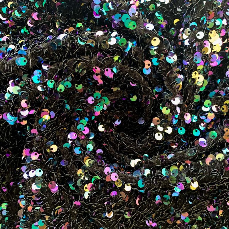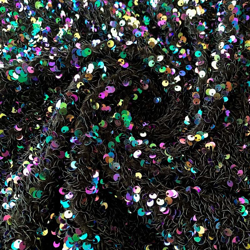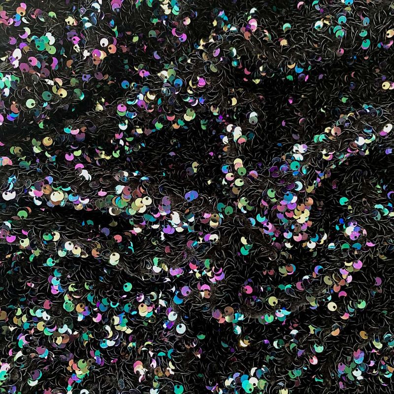 Бархатное полотно черного цвета по всей поверхности усеяно объемными глянцевыми "бензиновыми" пайетками. Ткань пластичная, прекрасно драпируется и укладывается в складки. Легко садится на фигуру за счёт основы с эластаном. Пайетки на бархате эффектно смотрятся в виде широких оборок и воланов, юбок прямого силуэта, свободных платьев-балахонов, курток, бомберов и топов с напусками.