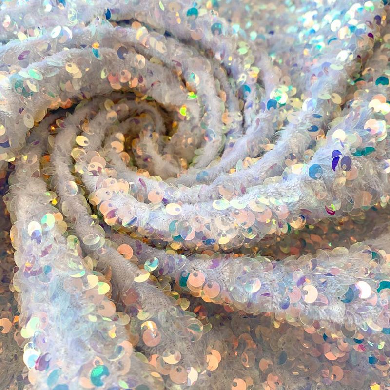 Бархатное полотно белого цвета по всей поверхности усеяно объемными глянцевыми "бензиновыми" пайетками. Ткань пластичная, прекрасно драпируется и укладывается в складки. Легко садится на фигуру за счёт основы с эластаном. Пайетки на бархате эффектно смотрятся в виде широких оборок и воланов, юбок прямого силуэта, свободных платьев-балахонов, курток, бомберов и топов с напусками.
