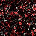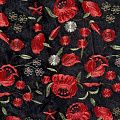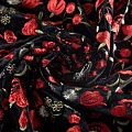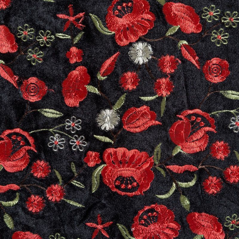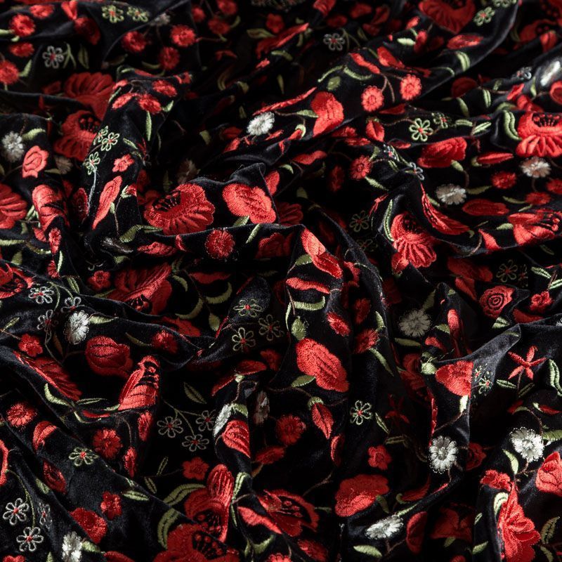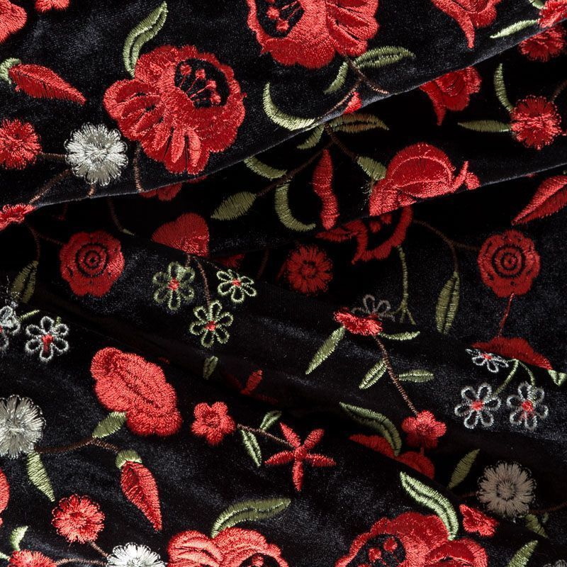 Итальянский бархат черного цвета, декорирован вышивкой фантазийными цветами в красных оттенках, расположенной по всему полотну.  Ткань приятная на ощупь, хорошо драпируется и держит форму, обладает благородным блеском, тянется за счет эластана в составе. Прекрасно подойдет для жакета, юбки, костюма, жилета, платья.