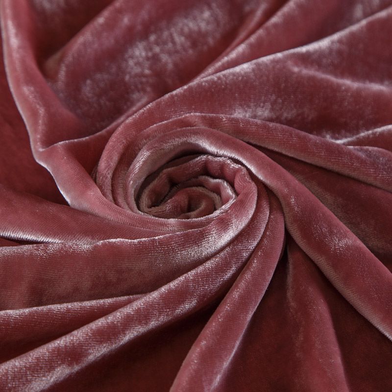 Итальянский бархат из шелка и вискозы. Ткань средней плотности, мягкая и гладкая на ощупь, с легким блеском, хорошо драпируется, струится. Идеальна для пошива платья, юбки, костюма в пижамном стиле, кимоно, туники.