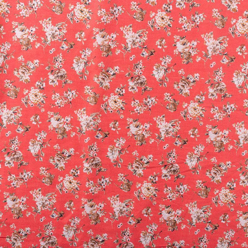 Итальянский хлопковый батист с мелким цветочным принтом в бежево-коричневых оттенках на коралловом фоне. Ткань очень легкая, прозрачная, приятная на ощупь, нежная, пластичная, хорошо и мягко драпируется, летящая. Батист подойдёт для модных блуз с объёмными рукавами, летних платьев и сарафанов с длинной летящей юбкой, прозрачных рубашек, декорированных объёмными бантами, туник и топов.