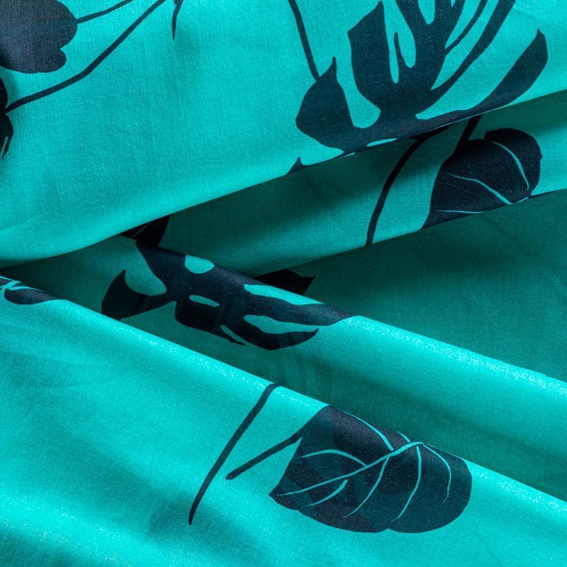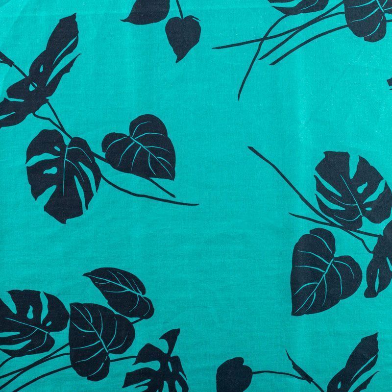 Итальянский хлопковый батист насыщенного бирюзового цвета с растительным прринтом. Ткань очень легкая, прозрачная, приятная на ощупь, нежная, пластичная, хорошо и мягко драпируется, летящая. Батист подойдёт для модных блуз с объёмными рукавами, летних платьев и сарафанов с длинной летящей юбкой, прозрачных рубашек, декорированных объёмными бантами, туник и топов.