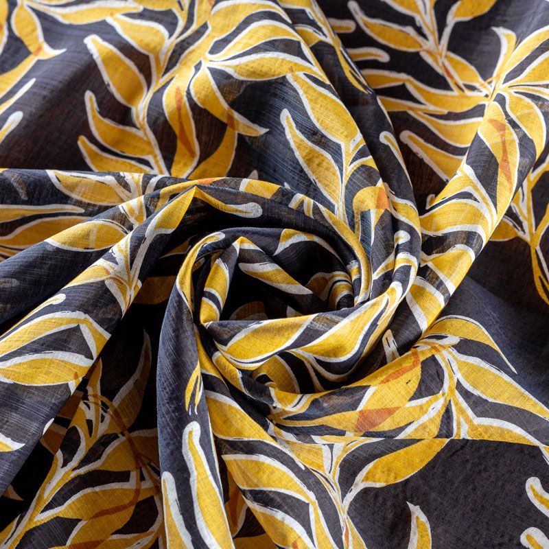 Батист с растительным принтом в молочно-желтых оттенках на темно-синем фоне. Ткань очень легкая, прозрачная, приятная на ощупь, нежная, пластичная, хорошо и мягко драпируется, летящая. Батист подойдёт для модных блуз с объёмными рукавами, летних платьев и сарафанов с длинной летящей юбкой, прозрачных рубашек, декорированных объёмными бантами, туник и топов.