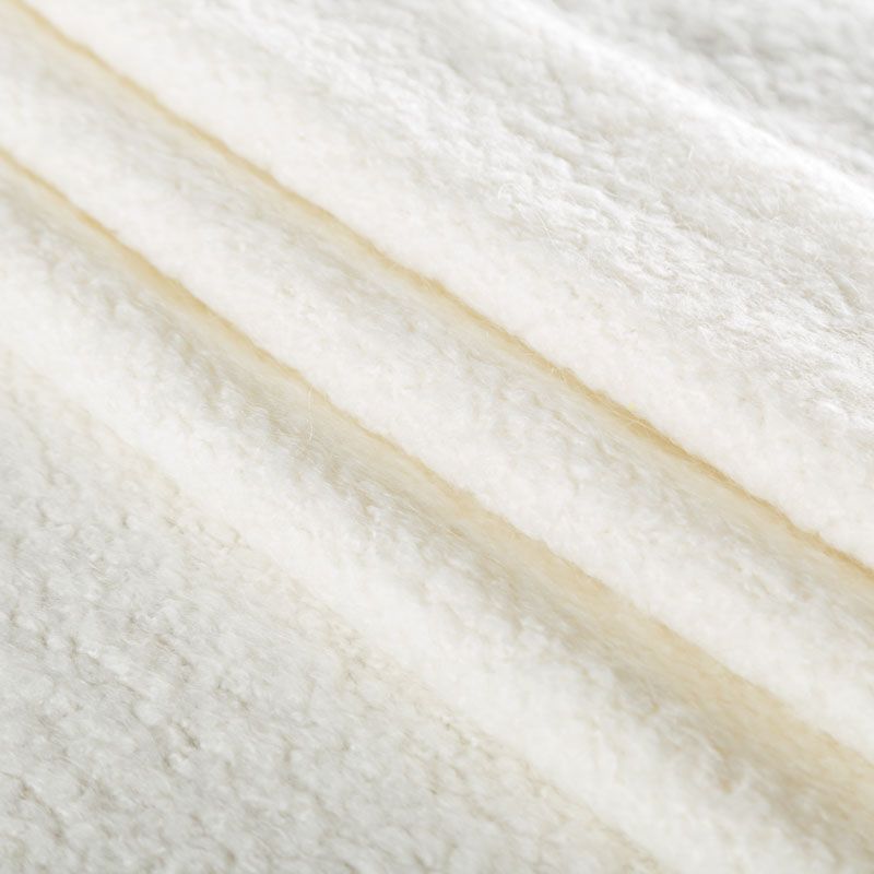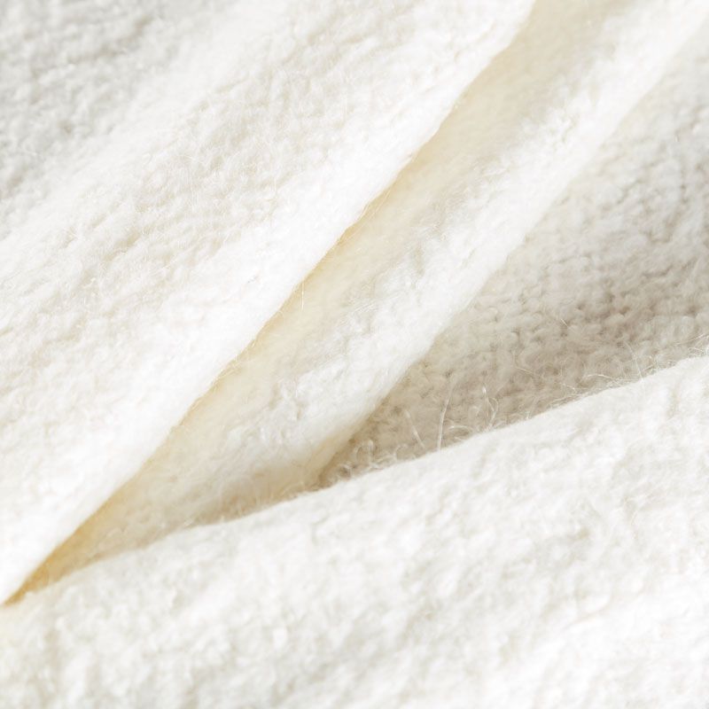 Итальянское шерстяное букле с кашемиром молочного оттенка. Ткань очень мягкая, достаточно плотная, пластичная, на вид объемная, хорошо держит тепло. Красивая фактура из кудрявого ворса эффектно будет смотреться в таких изделиях как пальто на осень, жакет, жилет, бомбер, куртка-рубашка.