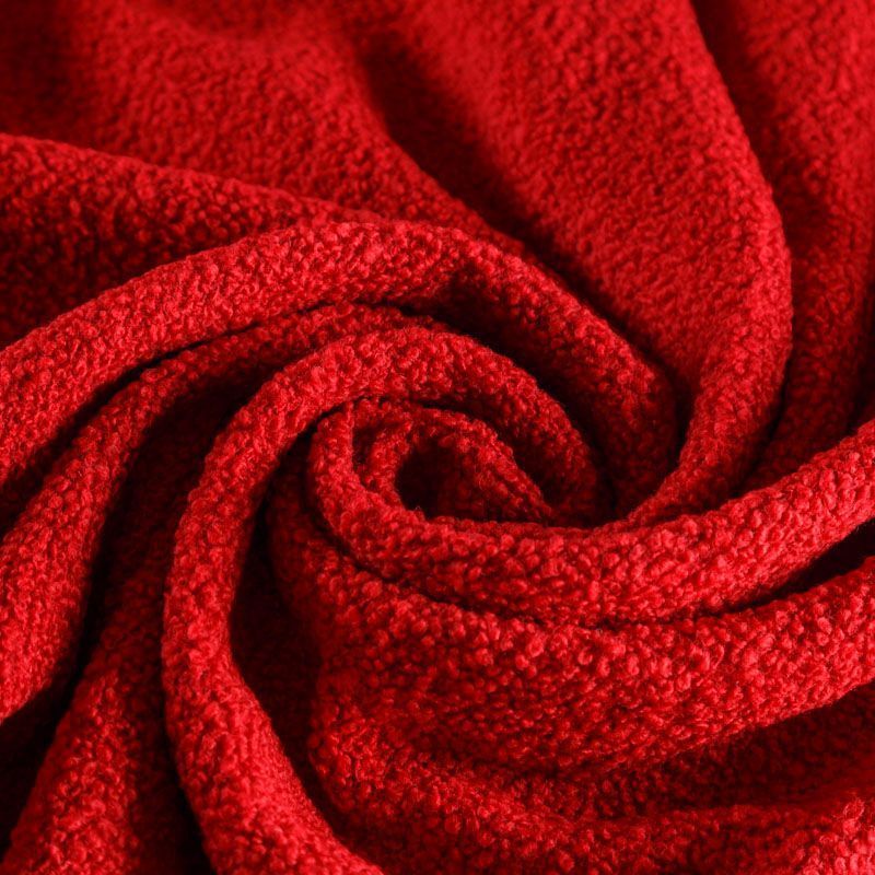 Итальянское шерстяное букле насыщенного красного оттенка. Ткань очень мягкая, достаточно плотная, на вид объемная, хорошо держит тепло. Красивая фактура из кудрявого ворса эффектно будет смотреться в таких изделиях как пальто на осень, жакет, жилет, бомбер, куртка-рубашка.