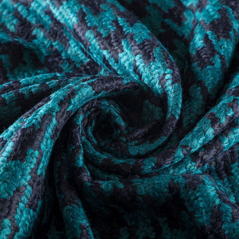 Плотная, объемная и фактурная ткань из шерсти в черно-бирюзовом цвете с жаккардовым узором гусиная лапка. Полотно не тяжелое, не сминается и износоустойчивое, не деформируется и не растягивается. Букле будет уместно для пошива пальто, кардигана, бомбера, куртки-рубашки, теплого костюма.