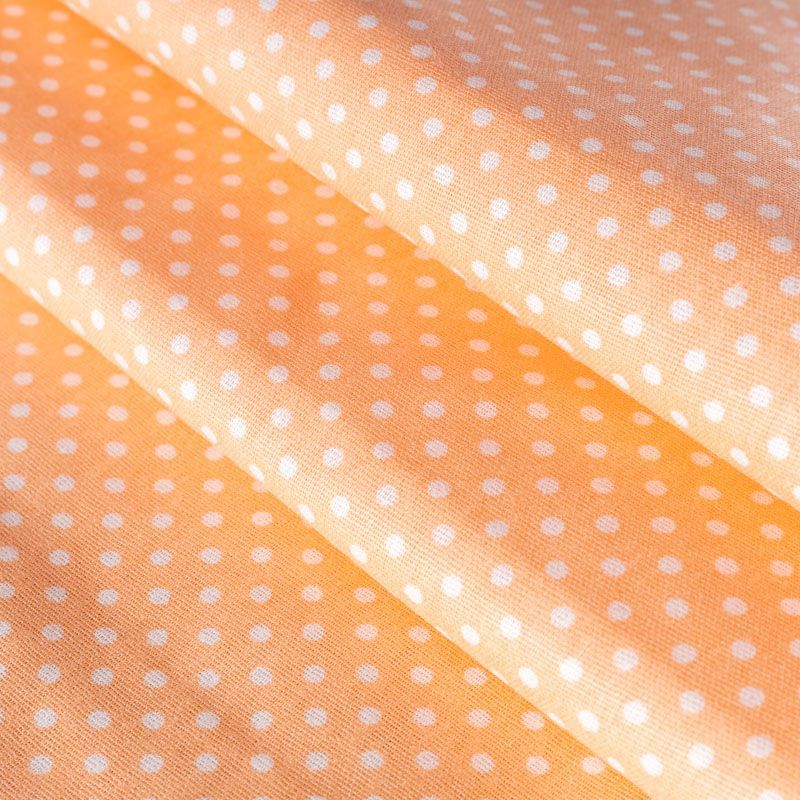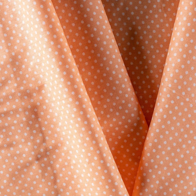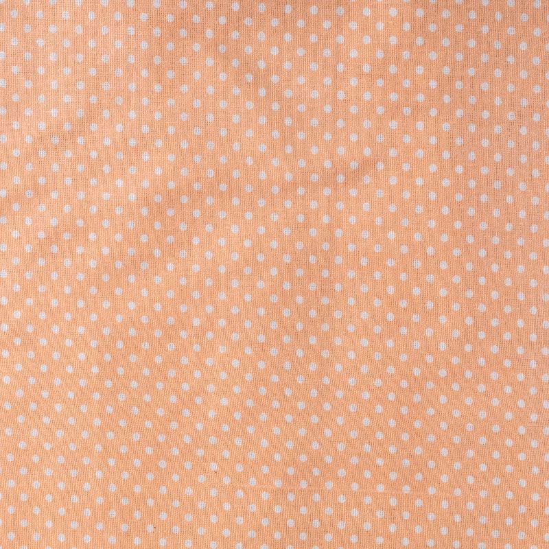 Плотная натуральная ткань с особым принципом переплетения нитей: крест-накрест. Имеет гладкую матовую поверхность чуть шероховатую на ощупь, не тянется, немного просвечивает. Прочная и стойкая к износу, надолго сохраняет яркость красок, не растягивается при стирке, практически не мнется. Мелкий белый горошек (3 мм) на нежном персиковом фоне прекрасно подойдет для пошива постельного белья, изготовления пеленок, бортиков для кроватки, домашней одежды и других предметов интерьера.