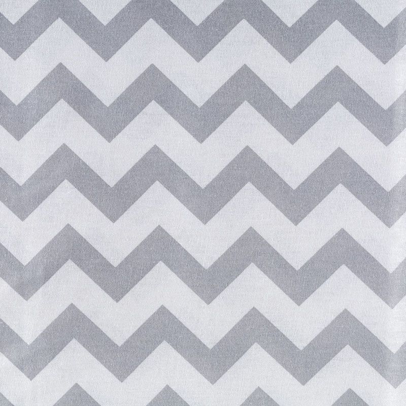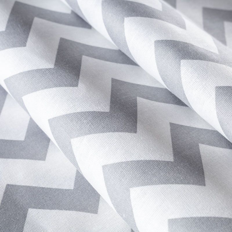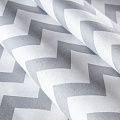 Плотная натуральная ткань с особым принципом переплетения нитей: крест-накрест. Имеет гладкую матовую поверхность чуть шероховатую на ощупь, не тянется, немного просвечивает. Прочная и стойкая к износу, надолго сохраняет яркость красок, не растягивается при стирке, практически не мнется. Принт в виде чередующихся полос белого и серого цвета в форме зигзага прекрасно подойдет для пошива постельного белья, изготовления пеленок, бортиков для кроватки и других предметов домашней одежды и интерьера.