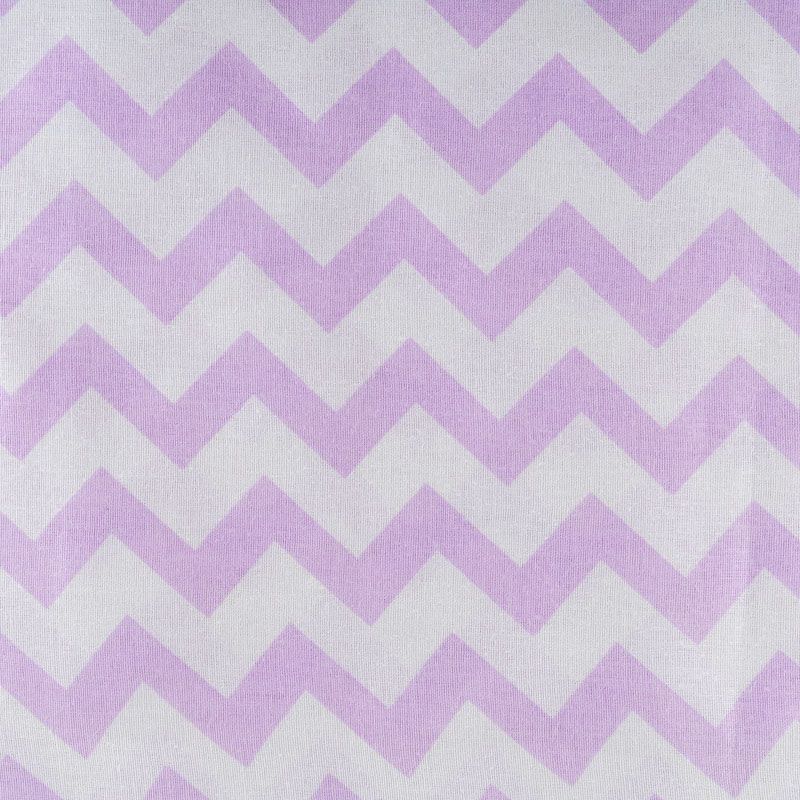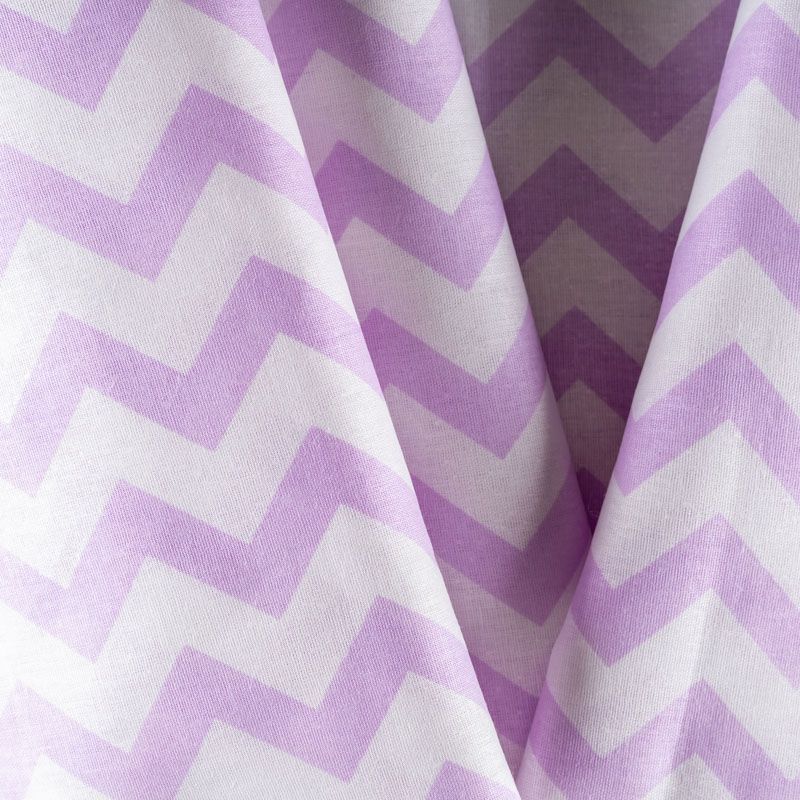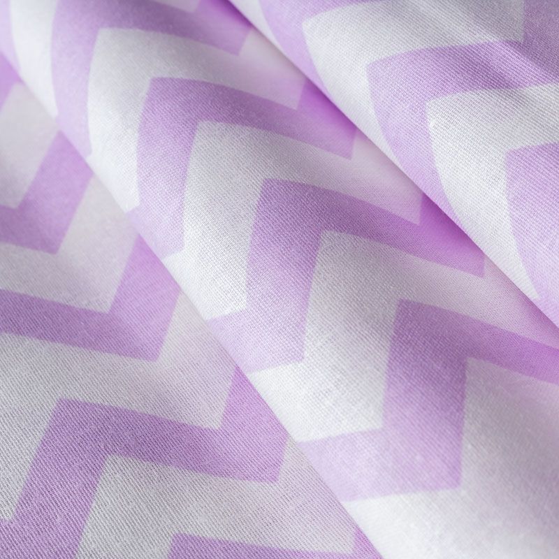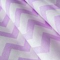 Плотная натуральная ткань с особым принципом переплетения нитей: крест-накрест. Имеет гладкую матовую поверхность чуть шероховатую на ощупь, не тянется, немного просвечивает. Прочная и стойкая к износу, надолго сохраняет яркость красок, не растягивается при стирке, практически не мнется. Принт в виде чередующихся полос белого и сиреневого цвета в форме зигзага прекрасно подойдет для пошива постельного белья, изготовления пеленок, бортиков для кроватки и других предметов домашней одежды и интерьера.