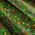 Плотная натуральная ткань с особым принципом переплетения нитей: крест-накрест. Имеет гладкую матовую поверхность, немного шероховатая на ощупь, не тянется, немного просвечивает. Прочная и стойкая к износу, надолго сохраняет яркость красок, практически не мнется. Мелкий цветочный принт на зеленом фоне прекрасно подойдет для пошива домашней одежды, халатов, фартуков, сарафанов и других предметов интерьера.