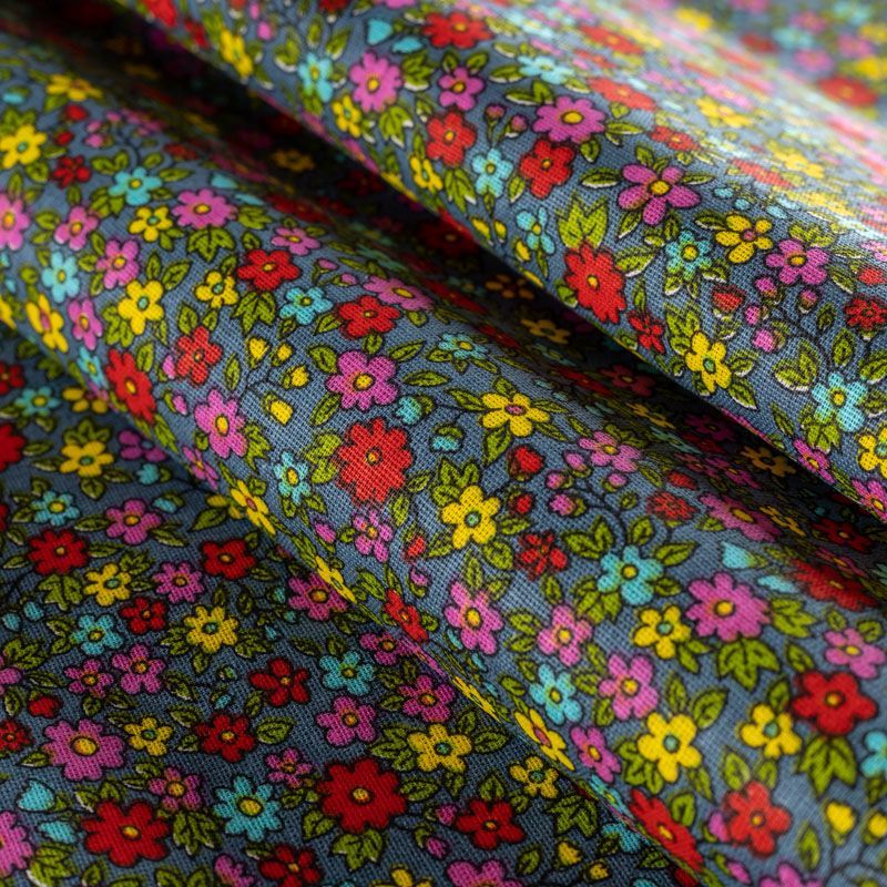 Плотная натуральная ткань с особым принципом переплетения нитей: крест-накрест. Имеет гладкую матовую поверхность, немного шероховатая на ощупь, не тянется, немного просвечивает. Прочная и стойкая к износу, надолго сохраняет яркость красок, практически не мнется. Мелкий цветочный принт на сером фоне прекрасно подойдет для пошива домашней одежды, халатов, фартуков, сарафанов и других предметов интерьера.