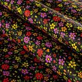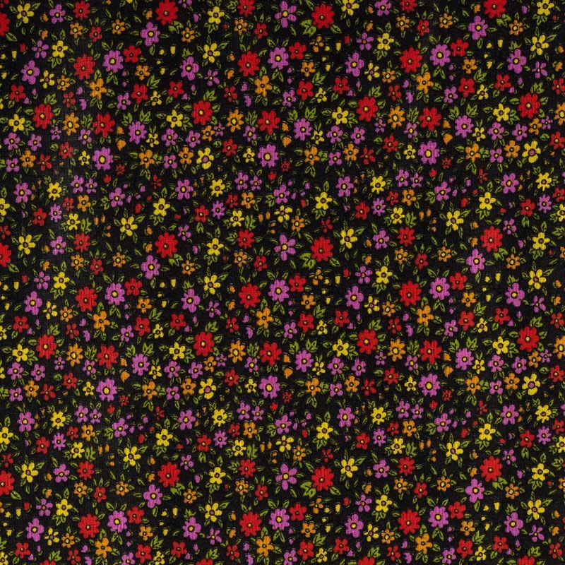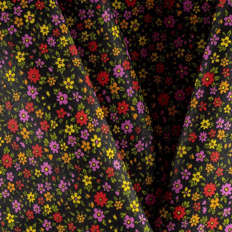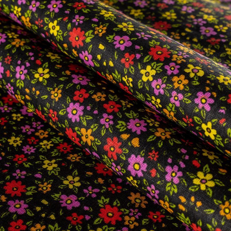Плотная натуральная ткань с особым принципом переплетения нитей: крест-накрест. Имеет гладкую матовую поверхность, немного шероховатая на ощупь, не тянется, немного просвечивает. Прочная и стойкая к износу, надолго сохраняет яркость красок, практически не мнется. Мелкий цветочный принт на темном фоне прекрасно подойдет для пошива домашней одежды, халатов, фартуков, сарафанов и других предметов интерьера.