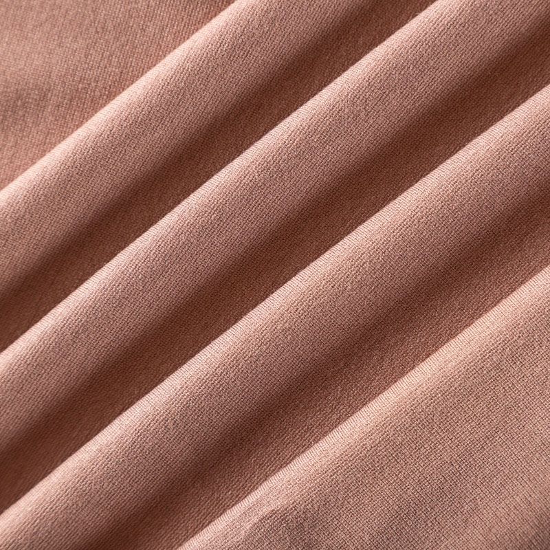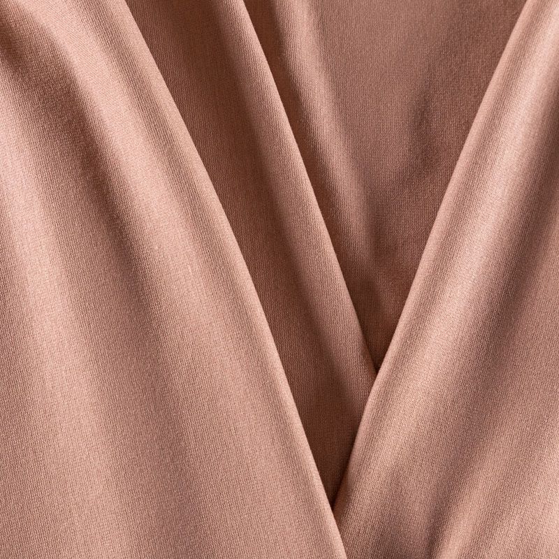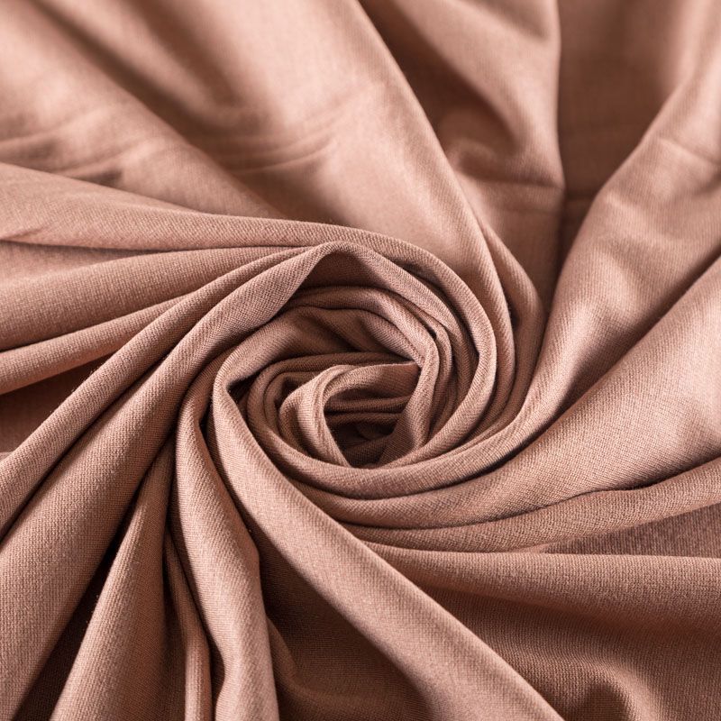 Плотное трикотажное полотно теплого коричневого оттенка. Обе стороны ткани ровные, гладкие. Материал эластичный, имеет растяжимость по всем сторонам, хорошо держит форму, уютный, приятный к телу и удобный в носке. Применяется в пошиве платьев, юбок, костюмов, жакетов.