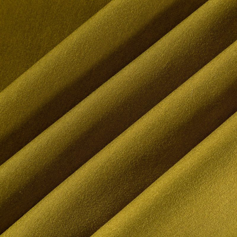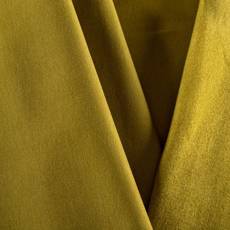 Эластичный, плотный хлопковый трикотаж темного оттенка горчицы. Поверхность ткани гладкая и матовая, с изнанки - с шелковистым мягким ворсом. Материал упругий, имеет растяжимость по всем сторонам, не просвечивается, хорошо держит форму, уютный, приятный к телу и удобный в носке. Применяется в пошиве костюмов, жакетов, кардиганов, платьев и юбок.