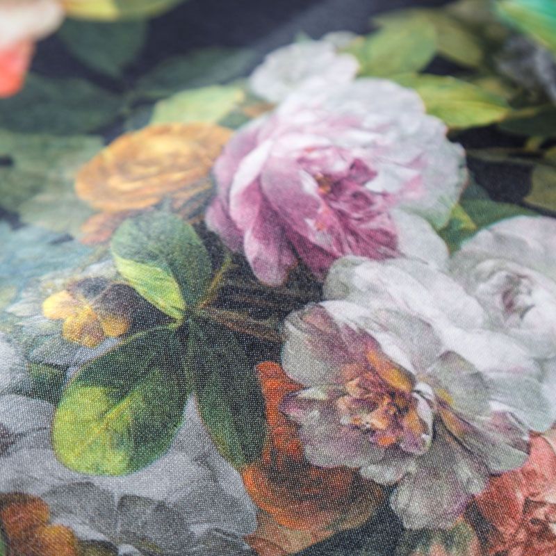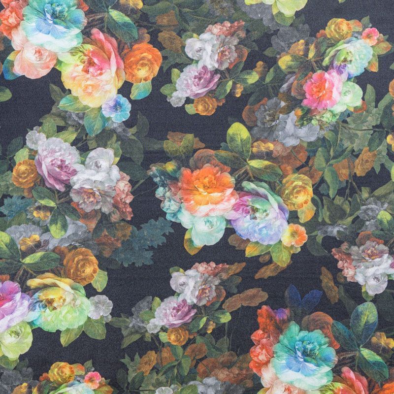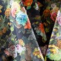 Трикотажное полотно средней плотности с цветочным принтом и слоем органзы. Обе стороны ткани ровные, гладкие. Материал эластичный, имеет растяжимость по всем сторонам, хорошо держит форму, уютный, приятный к телу и удобный в носке. Применяется в пошиве платьев, юбок, костюмов, жакетов.