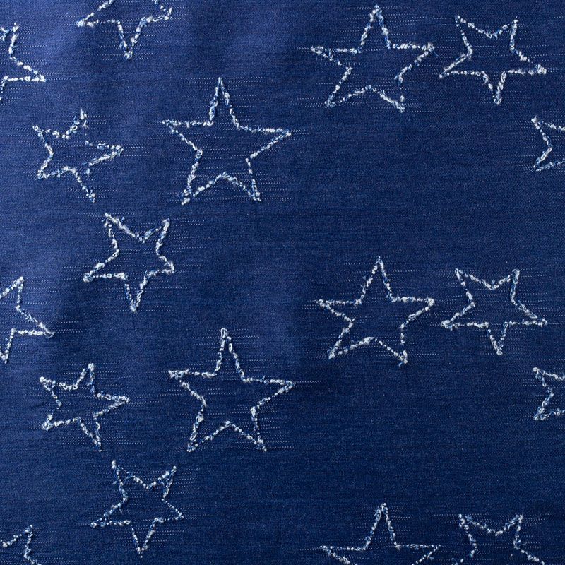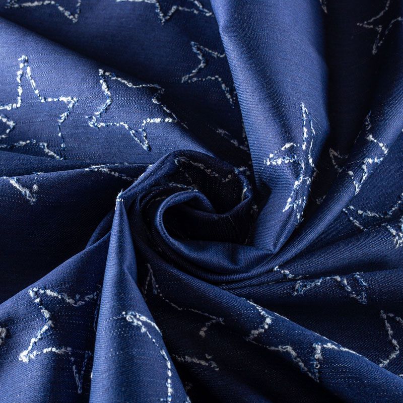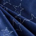 Плотная джинсовая ткань классического синего оттенка с жаккардовым узором в виде звезд. Ткань имеет диагональное плетение, не большую толщину, мягкая и приятная на ощупь, тянется за счет