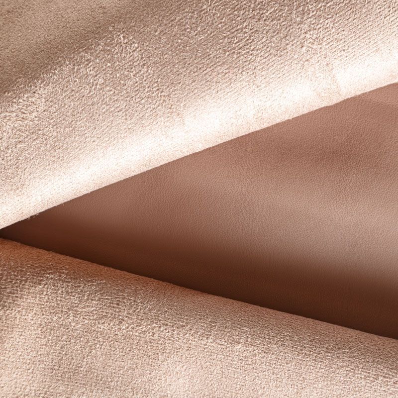 Искусственный материал, имитирующий натуральную кожу бежевого цвета. Поверхность ткани матовая, гладкая, изнаночная сторона с имитацией светлой замши. Приятная на ощупь, тянется, не просвечивает, пластичная. Подойдет для пошива куртки, костюма, платья, юбки, брюк, шорт, комбинезона, сумки, рюкзака.
