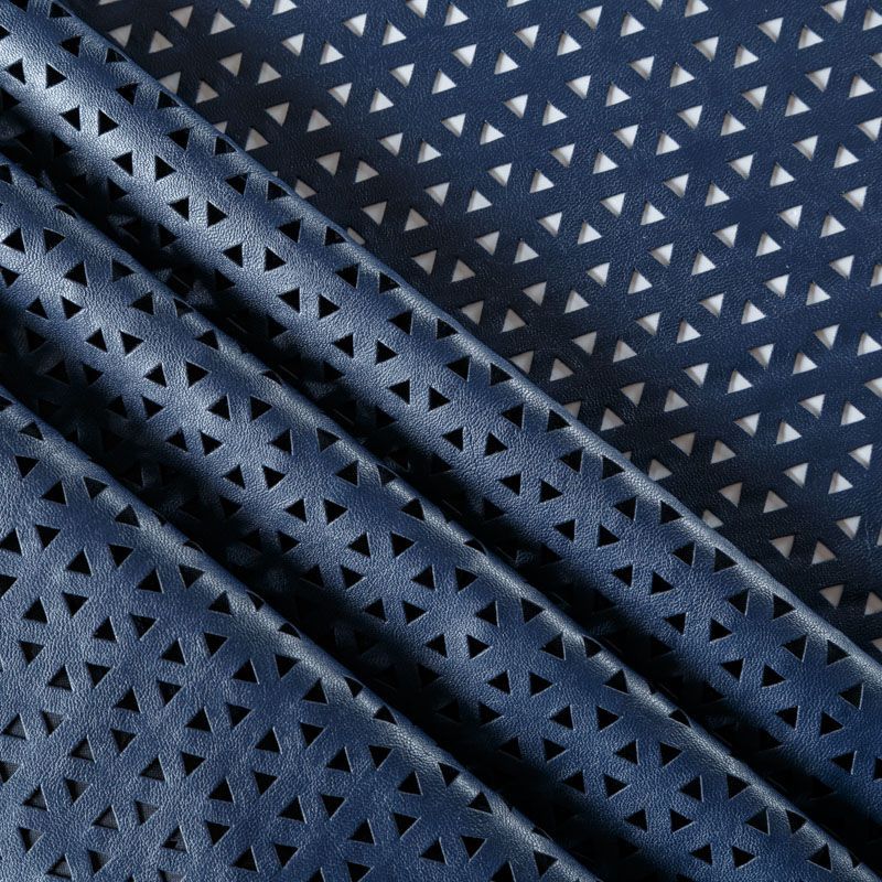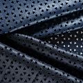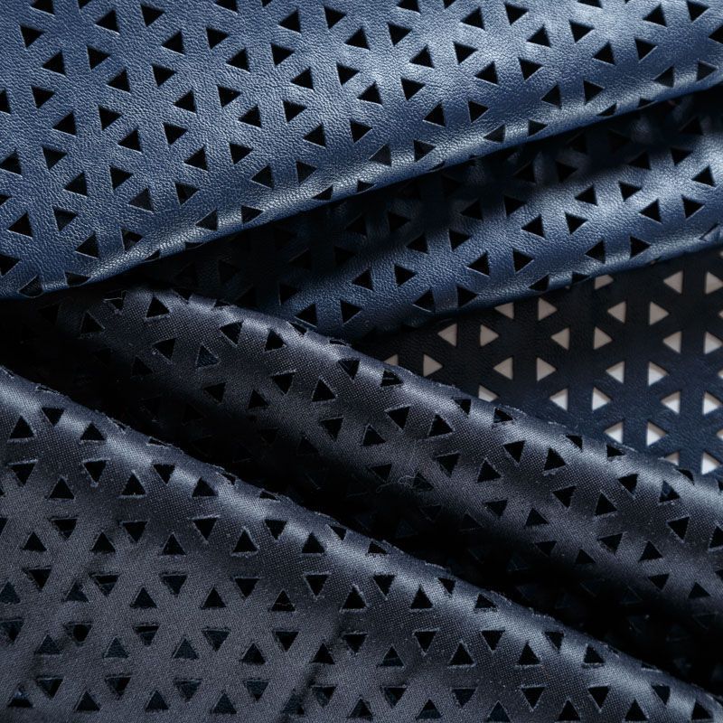 Искусственный материал, имитирующий натуральную кожу, на трикотажной основе. Поверхность матовая, с геометрической лазерной перфорацией. Экокожа тоньше натуральной, не мнется, пластична, тянется, хорошо облегает фигуру. Изнаночная сторона - черный трикотаж. Подойдет для пошива куртки, костюма, платья, юбки, брюк, шорт, комбинезона, сумки, рюкзака.