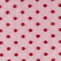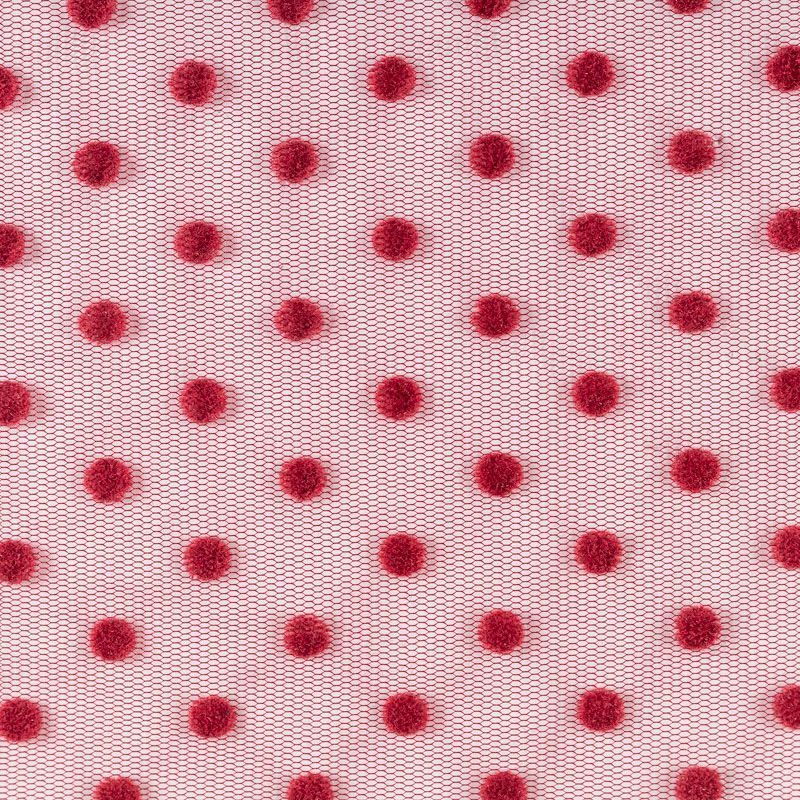 Нежный, мягкий и матовый фатин вишневого цвета. На лицевой стороне  объемные декоративные горошки среднего размера из флока. Хорошо драпируется, имеет мелкое сетчатое плетение, прияный на ощупь. Из него получатся нежные и воздушные наряды — пышные юбки-пачки, коктельные или вечерние платья.