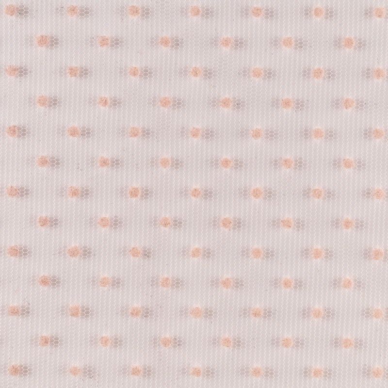 Нежный, мягкий и матовый фатин персиковго цвета. На лицевой стороне  объемные декоративные мелкие горошки из флока. Хорошо драпируется, имеет мелкое сетчатое плетение, прияный на ощупь. Из него получатся нежные и воздушные наряды — пышные юбки-пачки, коктельные или вечерние платья.