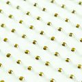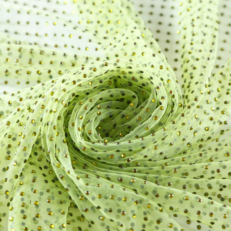 Тонкая прозрачная сетка средней жесткости зеленого оттенка декорирована клеевыми стразами в тон полотна. Используется для пошива одежды для различных праздников, концертов, пышных юбок, платьев, а также для отделки и украшения, создания предметов декора и украшения помещений для торжественных мероприятий.
