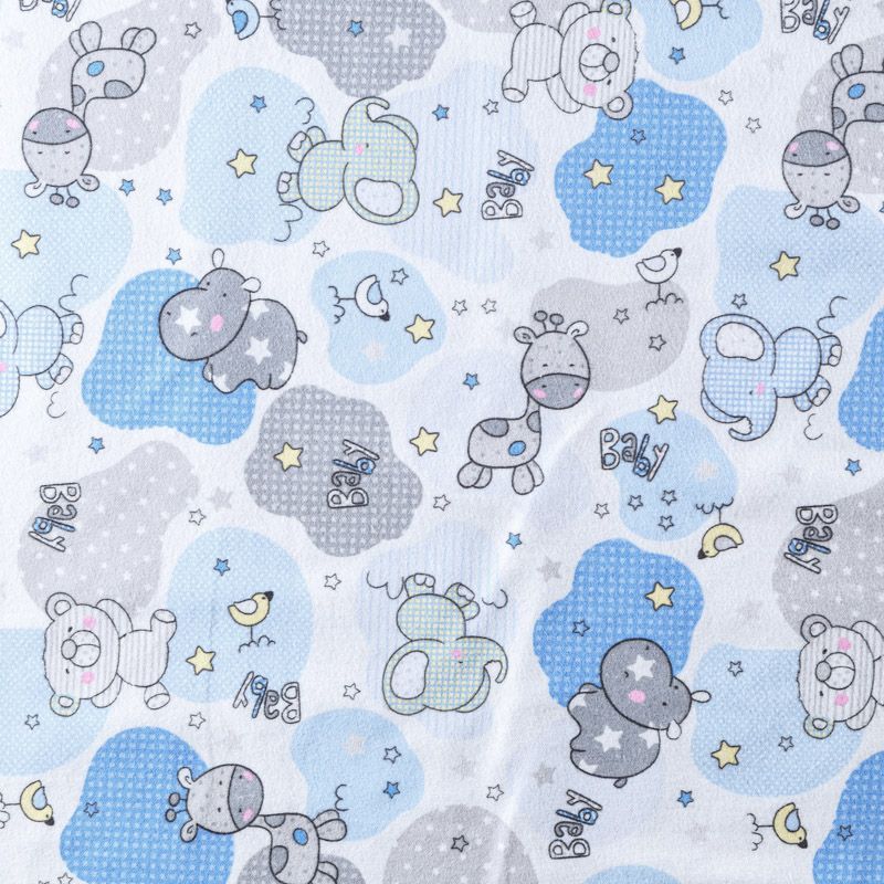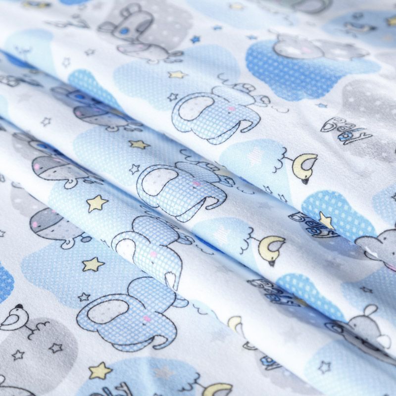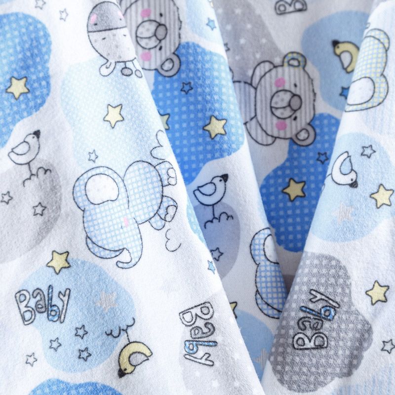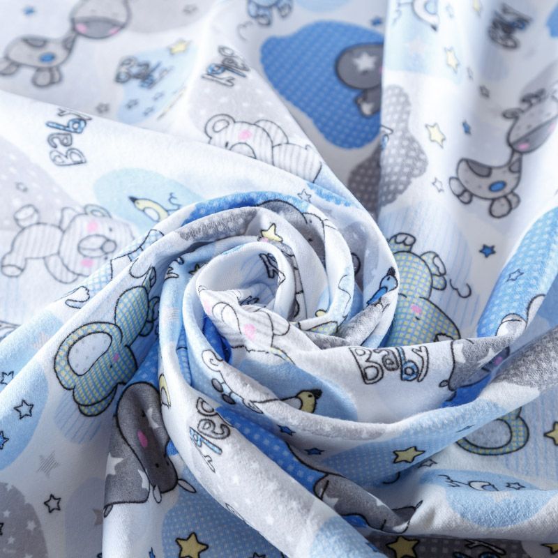 Износостойкий мягкий материал, не раздражает кожу, не садится, отлично впитывает влагу и хорошо удерживает тепло. На лицевой стороне мягкий ворс. Милый детский принт прекрасно подойдет для пошива постельного белья, изготовления пеленок, бортиков для кроватки, домашней одежды, пижамы и других предметов интерьера.