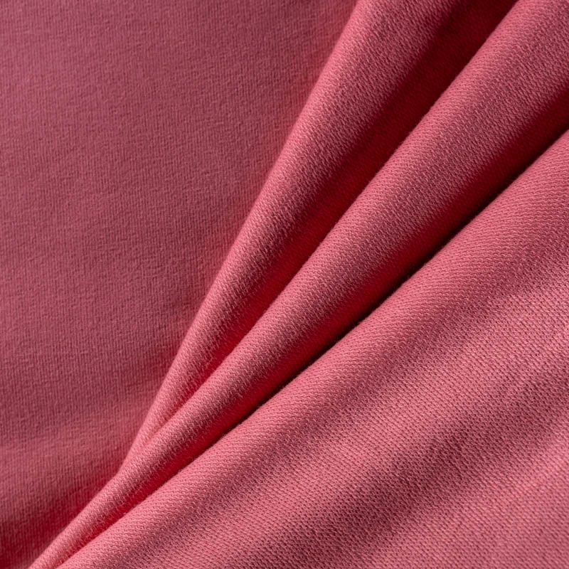 Плотный, но мягкий эластичный трикотаж. Лицевая сторона гладкая, без блеска, мелкой вязки. Изнанка – с небольшим однородным ворсом или петля. Прекрасный вариант для пошива платьев и костюмов, легких толстовок, свитшотов, спортивной, детской и  домашней одежды.