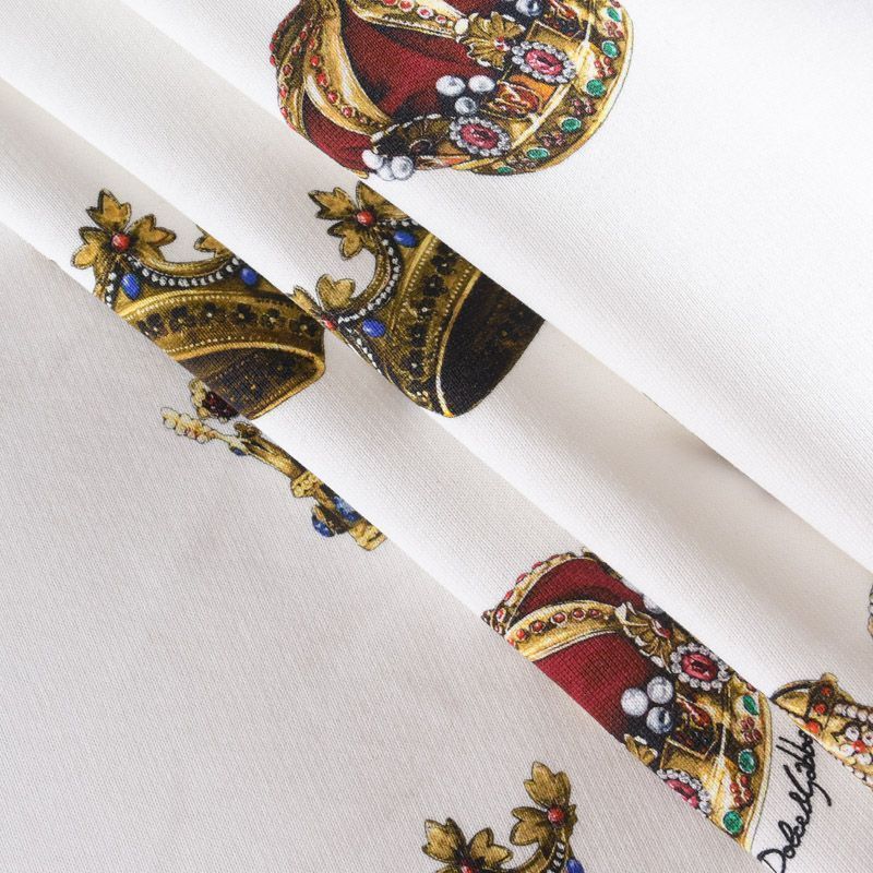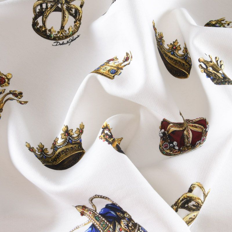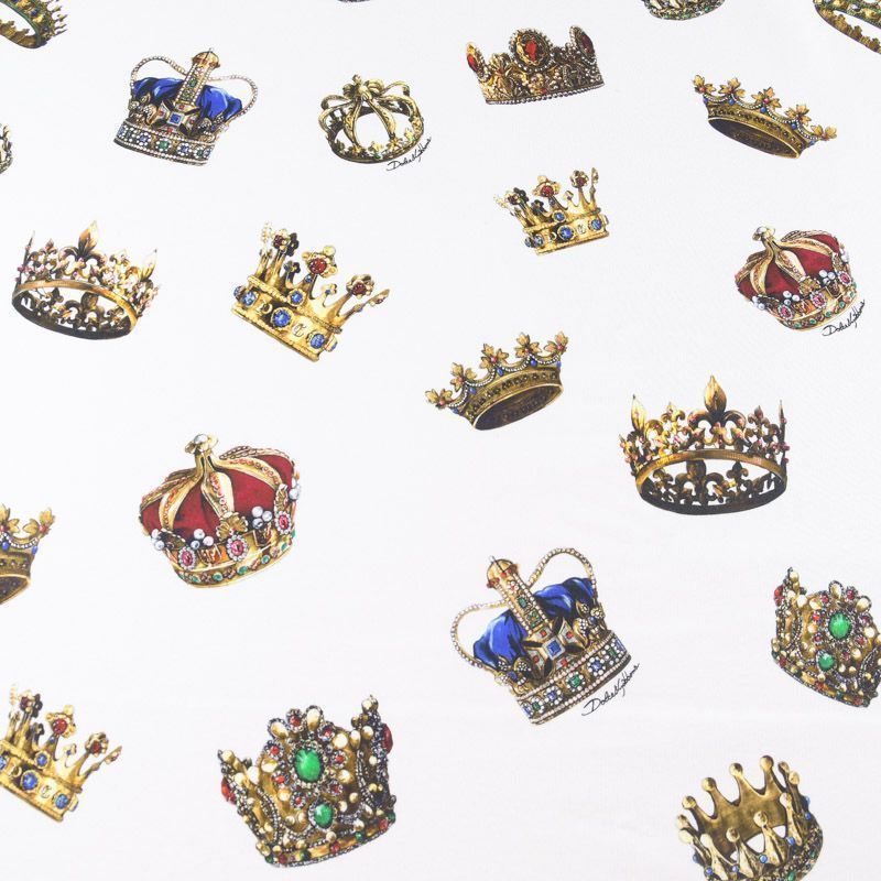 Итальянский брендовый футер с "королевским" принтом на белом фоне. Материал гладкий с лицевой стороны, с изнаночной стороны нанесен трикотажный тонкий дублерин, который дает стабильность полотну и держит форму изделий. Ткань мягкая и комфортная, достаточно эластичная, пластичная. Хорошо садится по фигуре. Практически не мнется. После растяжения быстро возвращается к прежней форме. Подойдет для пошива бомбера, легкого пальто, толстовки, спортивного костюма, джоггеров, шорт, свитшота, кроп-топа, платья в спортивном стиле.