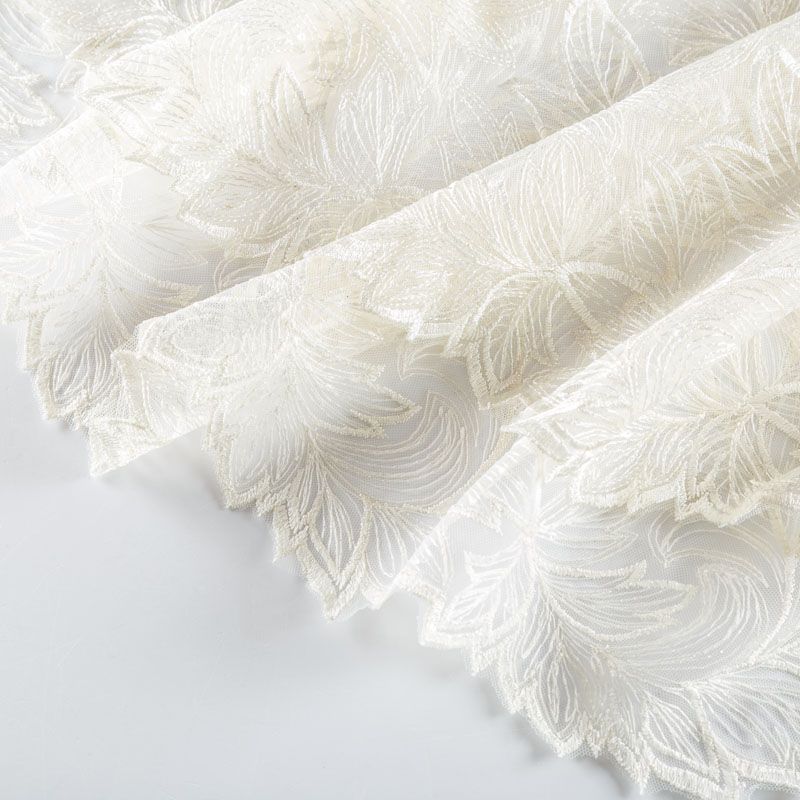 Кружевное полотно на сетчатой основе молочного оттенка с растительным узором, расположенным по ширине ткани. Тонкое, легкое, очень мягкое и пластичное, хорошо драпируется, приятное тактильно. Вышивка дополнена глянцевыми пайетками в тон. С обеих сторон ткань украшена симметричными фестонами, что придает полотну законченный и нарядный вид. Великолепно будет смотреться в нарядном вечернем, свадебном платье, платье на выпускной бал, в юбках, блузках, топах. На изделие набирается объемом.