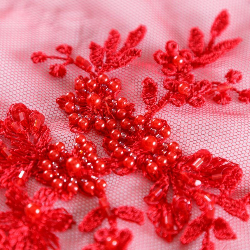 Вышивка на сетке красного оттенка с флористическим узором. Полотно мягкое, легкое и пластичное, хорошо тянется. Сетка не жесткая, приятная к телу. Узор вышит мягкой пряжей, образуя красивую фактуру, имитирующую ручную вышивку, и оформлен бисером. С обеих сторон ткань украшена симметричными фестонами, что придает полотну законченный и нарядный вид. Великолепно будет смотреться в нарядном вечернем платье, платье на выпускной бал, в блузках, топах. Набирается для изделия объемом.