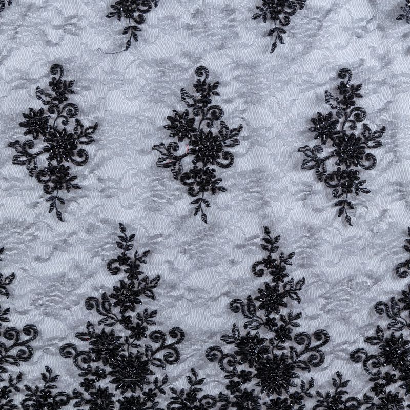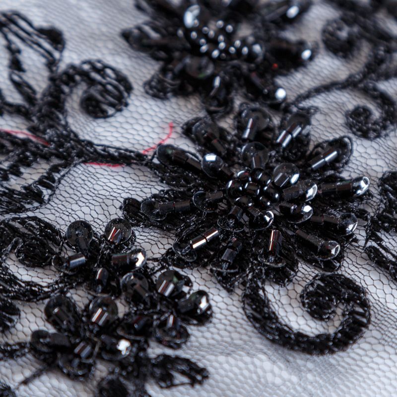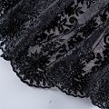 Вышивка на сетке черного оттенка с флористическим узором. Полотно мягкое, легкое и пластичное, хорошо тянется. Сетка не жесткая, приятная к телу. Узор вышит мягкой пряжей, образуя красивую фактуру, имитирующую ручную вышивку, и оформлен бисером и стеклярусом. С обеих сторон ткань украшена симметричными фестонами, что придает полотну законченный и нарядный вид. Великолепно будет смотреться в нарядном вечернем платье, платье на выпускной бал, в блузках, топах. Набирается для изделия объемом.