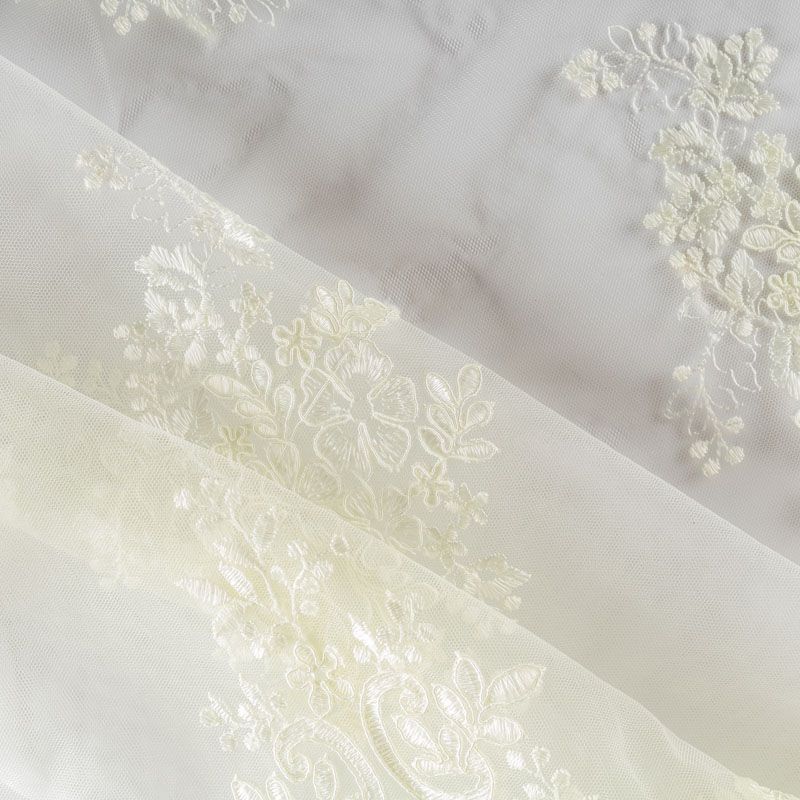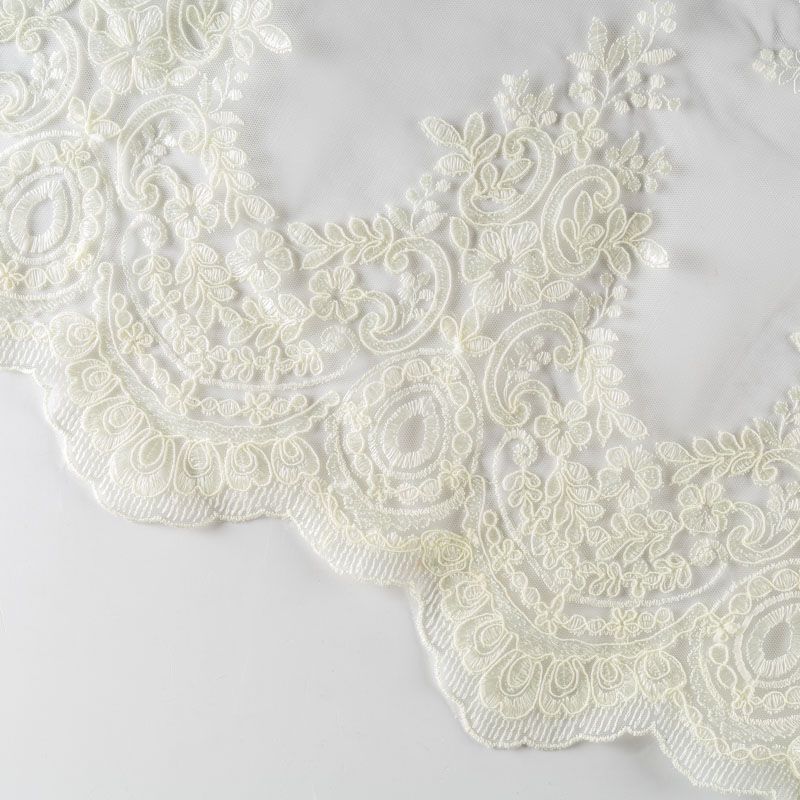 Вышивка на сетке нежного оттенка айвори с флористическим узором. Полотно мягкое, легкое и пластичное, хорошо тянется. Сетка не жесткая, приятная к телу. Узор вышит мягкой пряжей, образуя красивую фактуру, имитирующую ручную вышивку, и оформлен кордовой нитью. С обеих сторон ткань украшена симметричными фестонами, что придает полотну законченный и нарядный вид. Великолепно будет смотреться в нарядном вечернем, свадебном платье, платье на выпускной бал, в блузках, топах. Набирается для изделя объемом.
