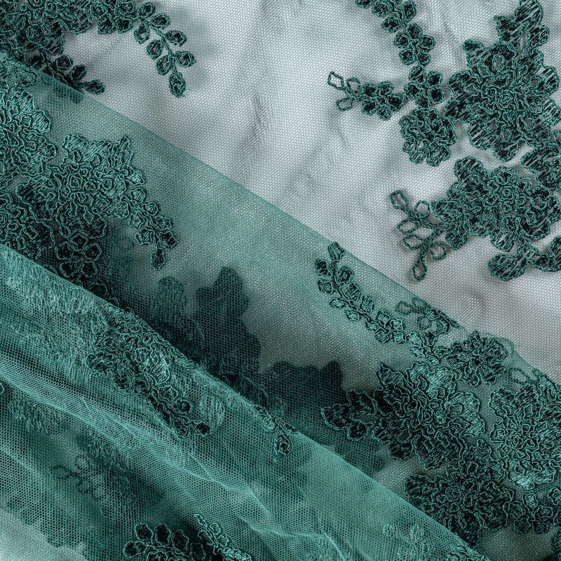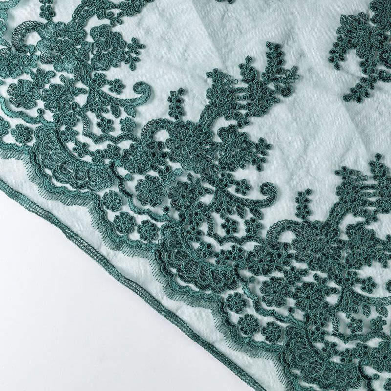 Вышивка на сетке темного оттенка зеленого бутылочного стекла с флористическим узором. Полотно мягкое, легкое и пластичное, хорошо тянется. Сетка не жесткая, приятная к телу. Узор вышит мягкой пряжей, образуя красивую фактуру, имитирующую ручную вышивку, и оформлен кордовой нитью. С обеих сторон ткань украшена симметричными фестонами, что придает полотну законченный и нарядный вид. Великолепно будет смотреться в нарядном вечернем, свадебном платье, платье на выпускной бал, в юбках, блузках, топах. Набирается для изделя объемом.