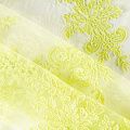 Кружевное полотно на сетчатой жаккардовой основе яркого лаймового неонового оттенка с флористическим узором. Тонкое, легкое, очень мягкое и пластичное, хорошо драпируется, приятное тактильно. Вышивка оформлена кордовой нитью. С обеих сторон ткань украшена симметричными фестонами, что придает полотну законченный и нарядный вид. Великолепно будет смотреться в нарядном вечернем, свадебном платье, платье на выпускной бал, в юбках, блузках, топах. Также можно применять отдельные элементы для декора, которые вырезаются из полотна.