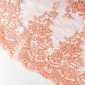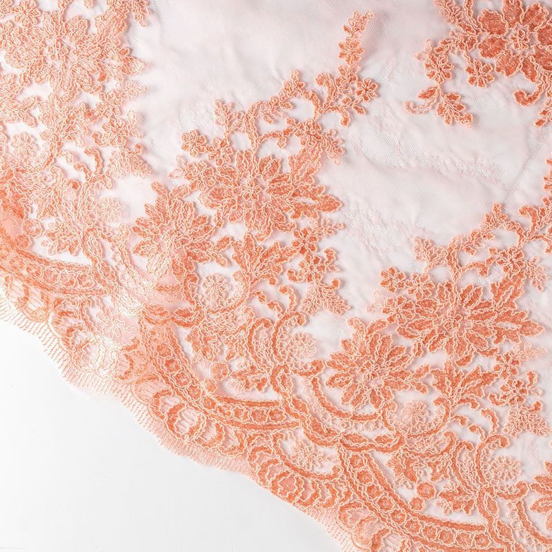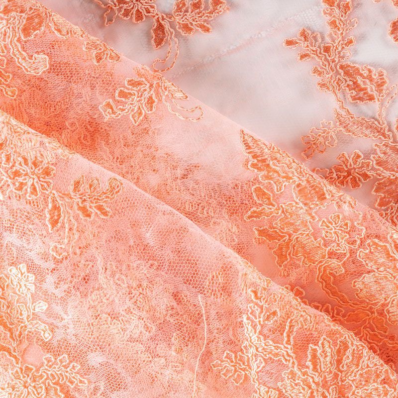 Кружевное полотно на сетчатой жаккардовой основе розового цвета с сочным смелым оттенком апельсина с флористическим узором. Тонкое, легкое, очень мягкое и пластичное, хорошо драпируется, приятное тактильно. Вышивка оформлена кордовой нитью. С обеих сторон ткань украшена симметричными фестонами, что придает полотну законченный и нарядный вид. Великолепно будет смотреться в нарядном вечернем, свадебном платье, платье на выпускной бал, в юбках, блузках, топах. Также можно применять отдельные элементы для декора, которые вырезаются из полотна.
