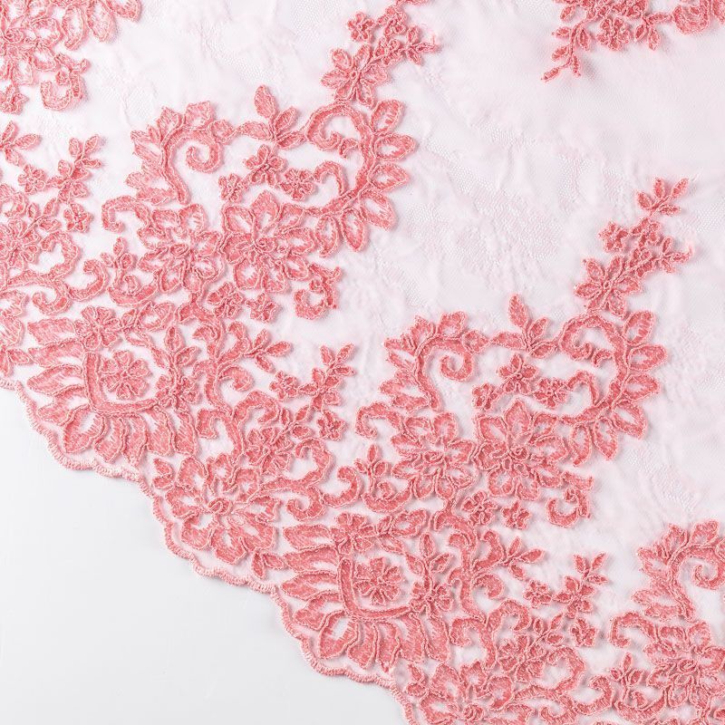 Кружевное полотно на сетчатой жаккардовой основе яркого корралового оттенка с флористическим узором. Тонкое, легкое, очень мягкое и пластичное, хорошо драпируется, приятное тактильно. Вышивка оформлена кордовой нитью. С обеих сторон ткань украшена симметричными фестонами, что придает полотну законченный и нарядный вид. Великолепно будет смотреться в нарядном вечернем, свадебном платье, платье на выпускной бал, в юбках, блузках, топах. Также можно применять отдельные элементы для декора, которые вырезаются из полотна.