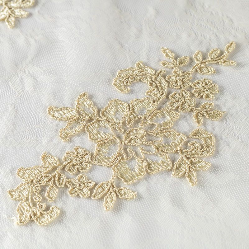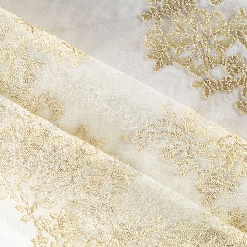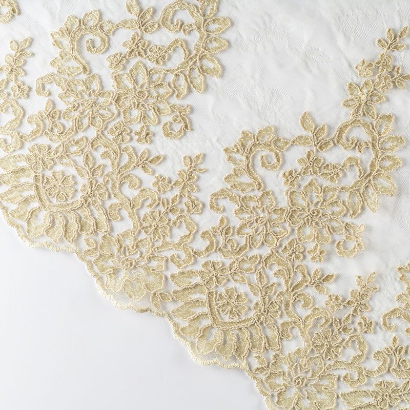 Кружевное полотно на сетчатой жаккардовой основе светлого золотистого оттенка с флористическим узором. Тонкое, легкое, очень мягкое и пластичное, хорошо драпируется, приятное тактильно. Вышивка оформлена кордовой нитью. С обеих сторон ткань украшена симметричными фестонами, что придает полотну законченный и нарядный вид. Великолепно будет смотреться в нарядном вечернем, свадебном платье, платье на выпускной бал, в юбках, блузках, топах. Также можно применять отдельные элементы для декора, которые вырезаются из полотна.