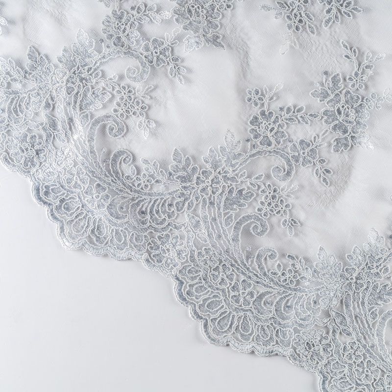Кружевное полотно на сетчатой жаккардовой основе жемчужного оттенка с флористическим узором. Тонкое, легкое, очень мягкое и пластичное, хорошо драпируется, приятное тактильно. Вышивка оформлена кордовой нитью. С обеих сторон ткань украшена симметричными фестонами, что придает полотну законченный и нарядный вид. Великолепно будет смотреться в нарядном вечернем, свадебном платье, платье на выпускной бал, в юбках, блузках, топах. Также можно применять отдельные элементы для декора, которые вырезаются из полотна.