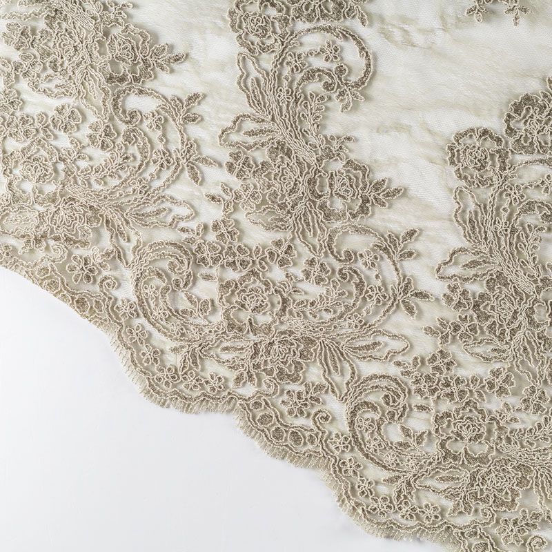 Кружевное полотно на сетчатой жаккардовой основе цвета фисташки с флористическим узором. Тонкое, легкое, очень мягкое и пластичное, хорошо драпируется, приятное тактильно. Вышивка оформлена кордовой нитью. С обеих сторон ткань украшена симметричными фестонами, что придает полотну законченный и нарядный вид. Великолепно будет смотреться в нарядном вечернем, свадебном платье, платье на выпускной бал, в юбках, блузках, топах. Также можно применять отдельные элементы для декора, которые вырезаются из полотна.