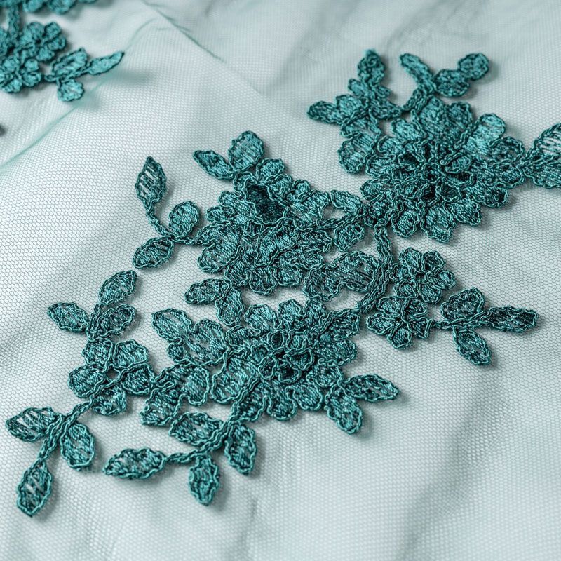 Вышивка на сетке темно-зеленого оттенка с флористическим узором. Полотно мягкое, легкое и пластичное, хорошо тянется. Сетка не жесткая, приятная к телу. Узор вышит мягкой пряжей, образуя красивую фактуру, имитирующую ручную вышивку, и оформлен кордовой нитью. С обеих сторон ткань украшена симметричными фестонами, что придает полотну законченный и нарядный вид. Великолепно будет смотреться в нарядном вечернем платье, платье на выпускной бал, в блузках, топах. Набирается для изделя объемом.