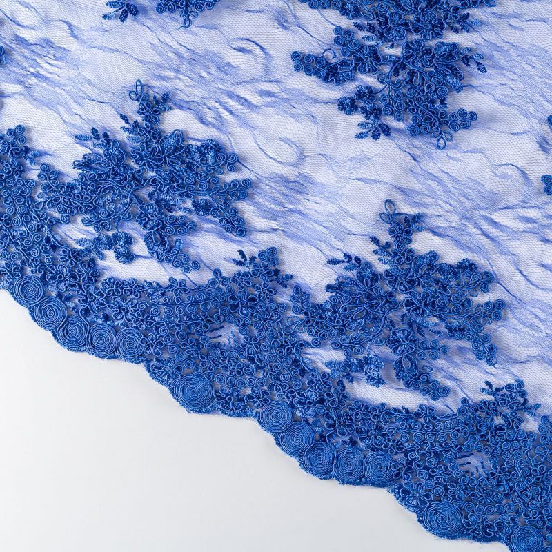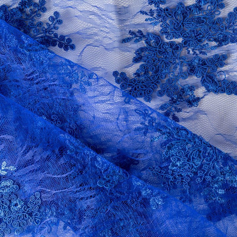 Кружевное полотно на сетчатой жаккардовой основе насыщенного синего оттенка с флористическим узором. Тонкое, легкое, очень мягкое и пластичное, хорошо драпируется, приятное тактильно. Вышивка оформлена кордовой нитью. С обеих сторон ткань украшена симметричными фестонами, что придает полотну законченный и нарядный вид. Великолепно будет смотреться в нарядном вечернем, свадебном платье, платье на выпускной бал, в юбках, блузках, топах. Также можно применять отдельные элементы для декора, которые вырезаются из полотна.