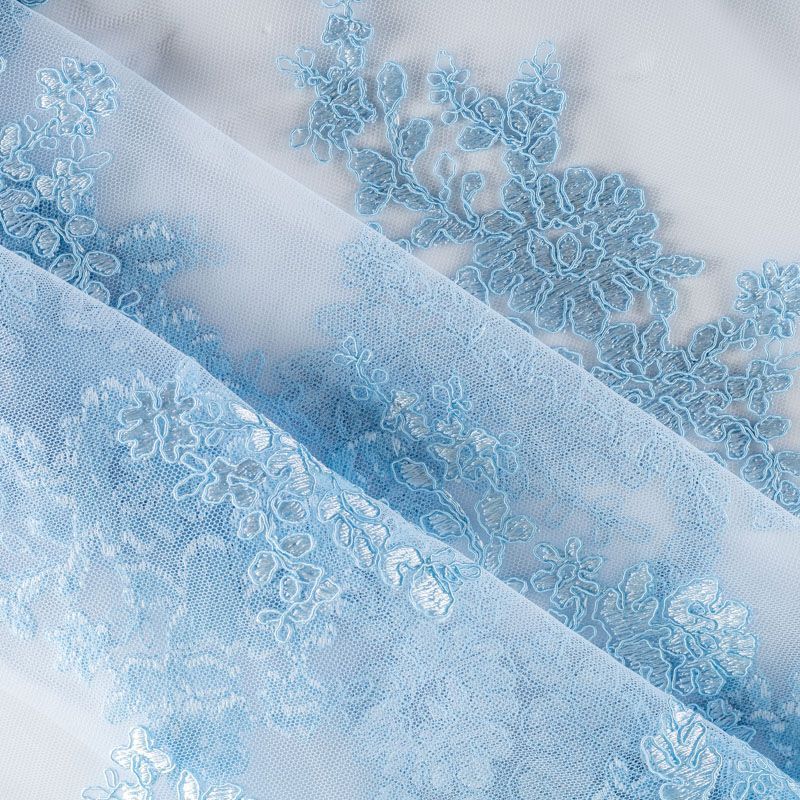 Вышивка на сетке нежного голубого оттенка с флористическим узором. Полотно мягкое, легкое и пластичное, хорошо тянется. Сетка не жесткая, приятная к телу. Узор вышит пряжей, образуя красивую фактуру, имитирующую ручную вышивку, и оформлен кордовой нитью. С обеих сторон ткань украшена симметричными фестонами, что придает полотну законченный и нарядный вид. Великолепно будет смотреться в нарядном вечернем платье, платье на выпускной бал, в блузках, топах. Набирается для изделя объемом.