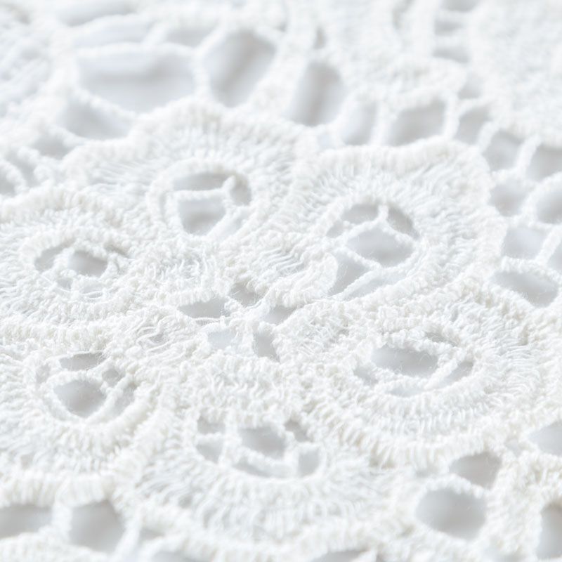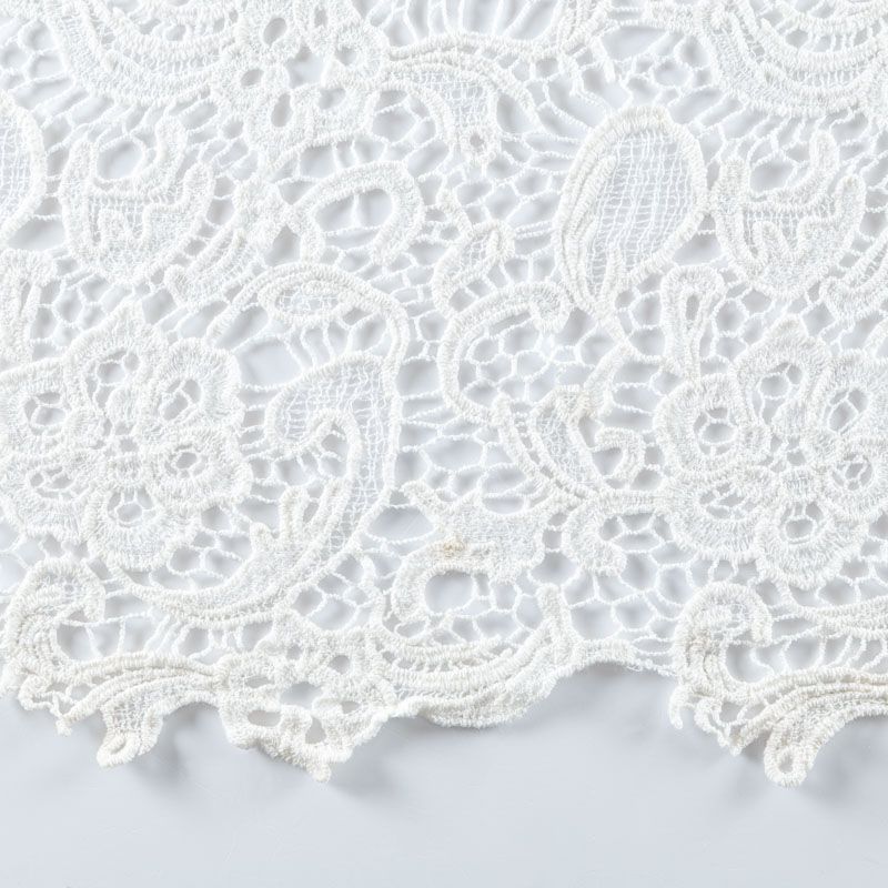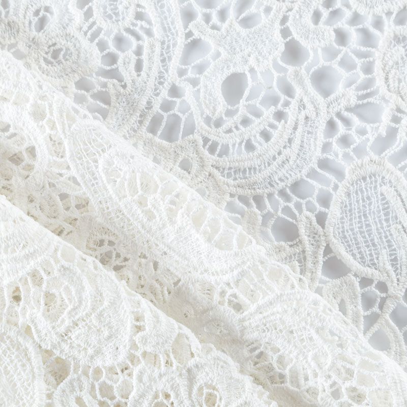 Итальянский хлопковый гипюр-макраме представляет собой ажурное полотно, имеющее рельефную текстуру с цветочным ажурным плетением по всей ширине. Материал прозрачный на теле и на просвет, требуется подклад. Всегда актуален при создании утончённых и роскошных нарядов, придавая им дороговизны и оригинальности. Может использоваться для пошива платьев, костюмов прямого кроя, изготовления декоративных элеметов.