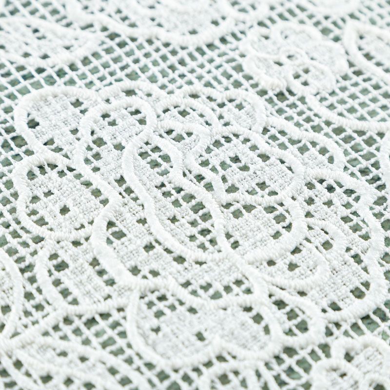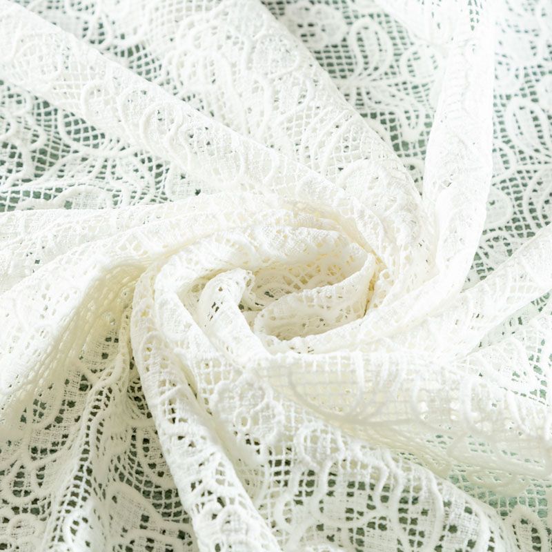 Гипюр-макраме представляет собой ажурное полотно, имеющее рельефную текстуру с цветочным ажурным плетением по всей ширине и фестоном по одной стороне кромки. Материал прозрачный на теле и на просвет, требуется подклад. Всегда актуален при создании утончённых и роскошных нарядов, придавая им дороговизны и оригинальности. Может использоваться для пошива платьев, костюмов прямого кроя, изготовления декоративных элеметов. Набирается на изделие объемом.